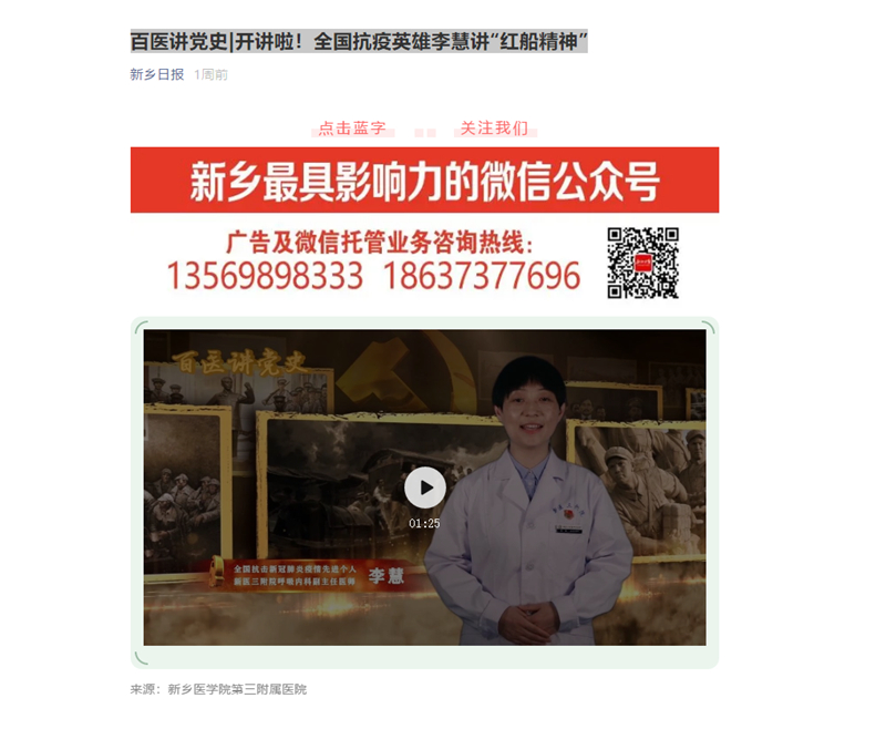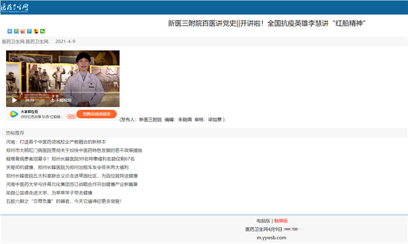 日前,新医三附院开展“百医讲党史”系列活动,人民网、医药卫生报、新乡日报等媒体对新医三附院“百医讲党史”第一期,全国抗疫英雄李慧讲“红船精神”视频进行转发和报道。